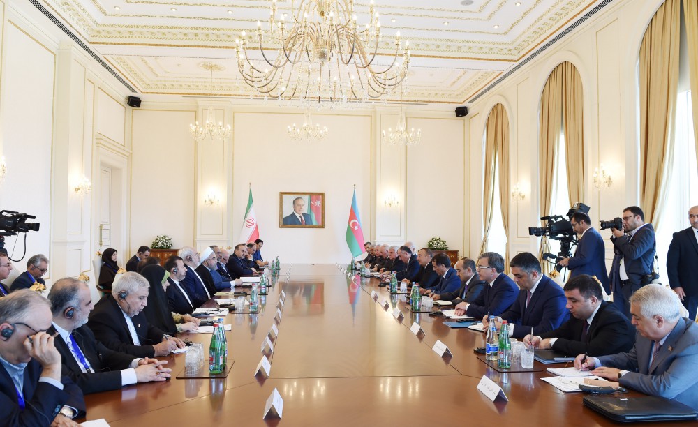 В воскресенье в Баку по завершении встречи один на один состоялась встреча Президента Азербайджана Ильхама Алиева с Президентом Ирана Хасаном Рухани в расширенном составе с участием делегаций обеих стран