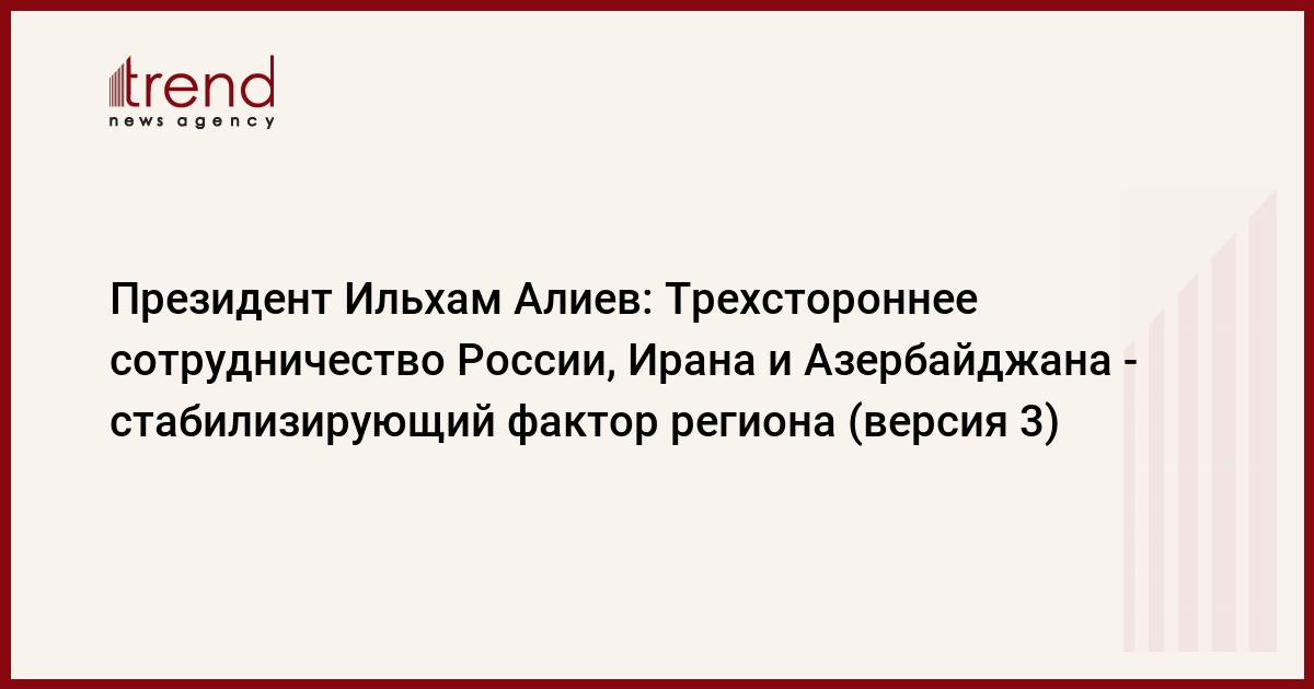 "Вчера состоялась моя встреча с Президентом Ирана господином Рухани, сегодня состоялась встреча с Президентом России господином Путиным. Сегодня также встретились Президенты России и Ирана. То есть, у этих встреч есть очень большой смысл. В действительности трехсторонний формат создается на основе двусторонних связей. Рад, что как отношения Азербайджана с Россией и Ираном, а также и отношения России с Ираном на очень высоком уровне, и развитие этих связей дает возможность нам сегодня не только говорить о новом формате сотрудничества, но и создать его. Регион, в котором мы живем, очень сложный, полон рисков и угроз, и со временем, к сожалению, эти риски не уменьшаются, а увеличиваются. В таком случае трехстороннее сотрудничество является основным условием безопасности в регионе. Трехстороннее сотрудничество России, Ирана и Азербайджана является стабилизирующим фактором в регионе", - сказал Президент Ильхам Алиев.