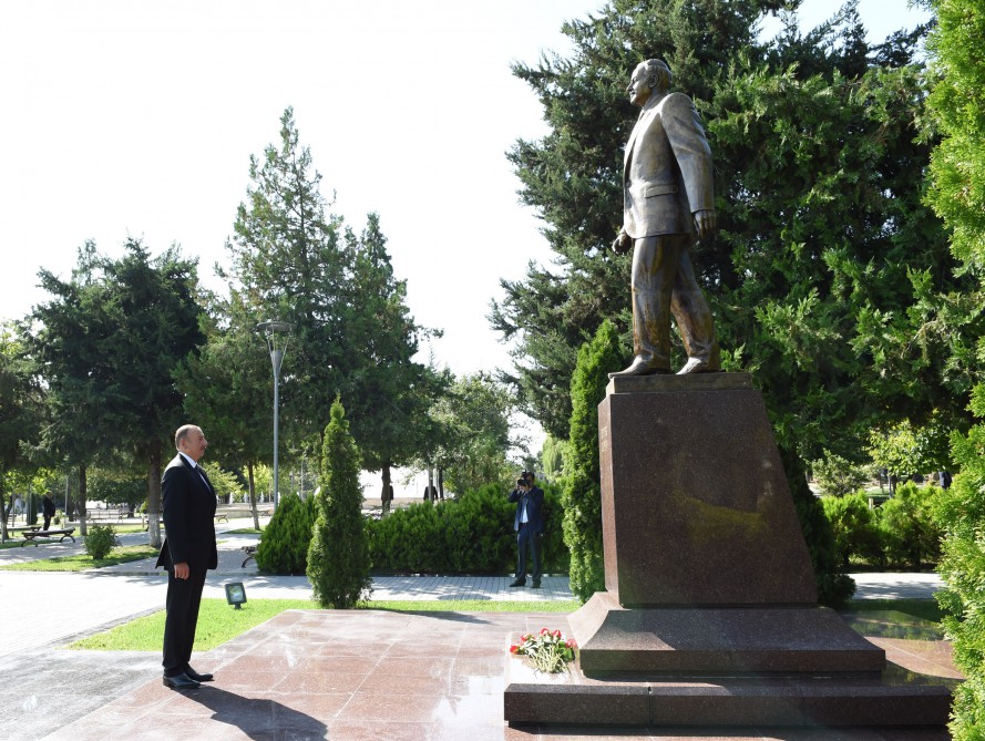 Сначала глава государства посетил памятник общенациональному лидеру азербайджанского народа Гейдару Алиеву в центре города Габала, возложил цветы к подножию памятника.