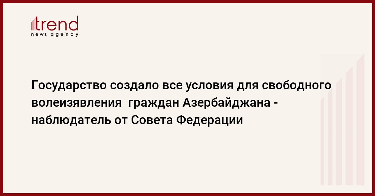 БАКУ /Trend/ - Государство создало все условия для того, чтобы граждане Азербайджана имели возможность сегодня высказать свое мнение по важнейшим решениям, которые определят будущее страны, заявил журналистам на состоявшемся в понедельник брифинге, председатель комитета по федеративному устройству, региональной политике, местному самоуправлению и делам Севера Совета федерации Федерального собрания РФ Дмитрий Азаров.