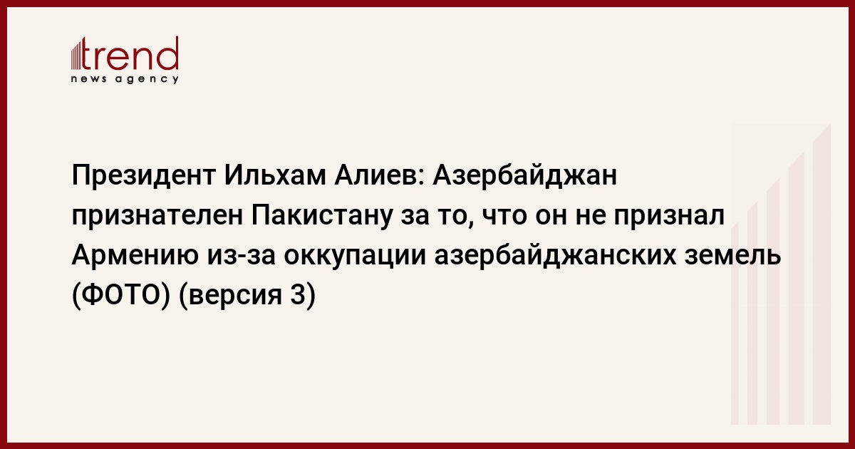 БАКУ /Trend/ - Азербайджан признателен Пакистану за то, что он не признал Армению из-за оккупации азербайджанских земель, сказал Президент Азербайджана Ильхам Алиев, выступая в пятницу в Баку вместе с премьер-министром Пакистана Мохаммадом Навазом Шарифом с заявлением для прессы.