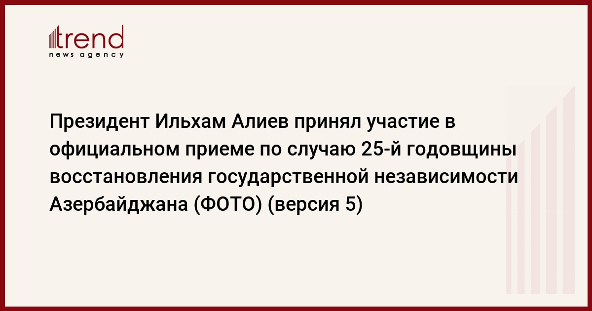 БАКУ /Trend/ - В Центре Гейдара Алиева в понедельник устроен официальный прием, посвященный 25-й годовщине восстановления государственной независимости Азербайджанской Республики.