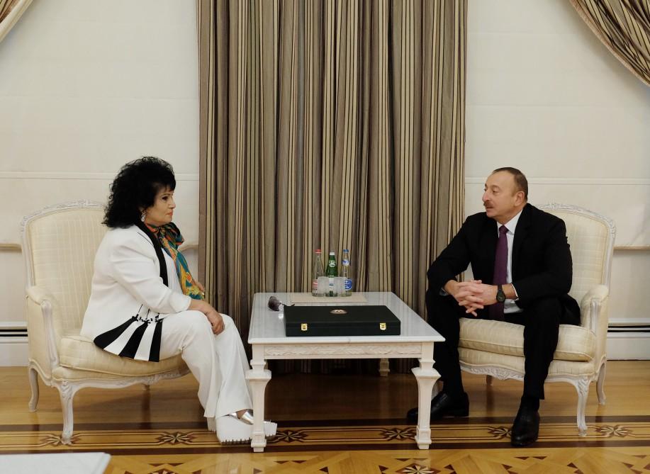Прежде всего, я сердечно поздравляю Вас с наступающим юбилеем, желаю Вам здоровья, новых успехов. Вы многие годы радуете наш народ своим прекрасным творчеством. Вам принадлежит очень большое место в музыкальной истории нашего народа. Вы – всемирно известная певица и пропагандируете в мире Азербайджан, наш народ, государство на протяжении многих лет - как в советские годы, так и в период независимости. Азербайджанский народ очень любит Вас. Вы это хорошо знаете.