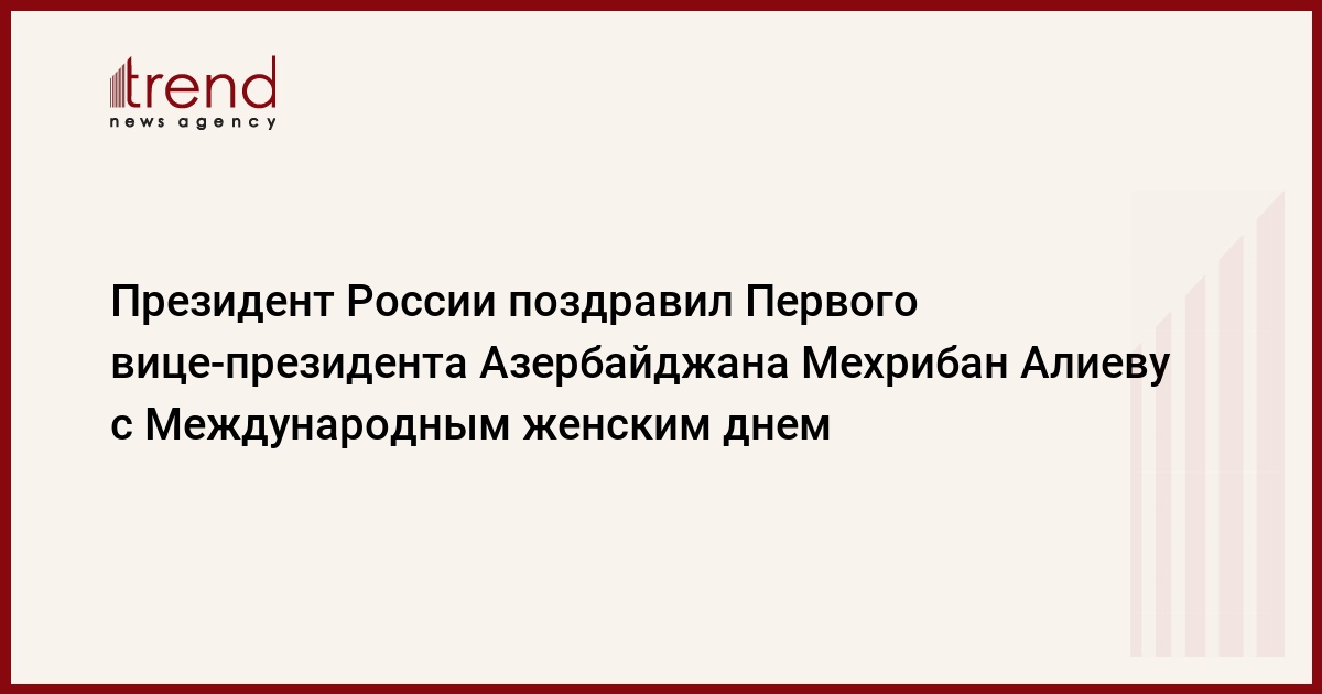 БАКУ /Trend/ - Президент России Владимир Путин поздравил Первого вице-президента Азербайджана Мехрибан Алиеву с Международным женским днем.