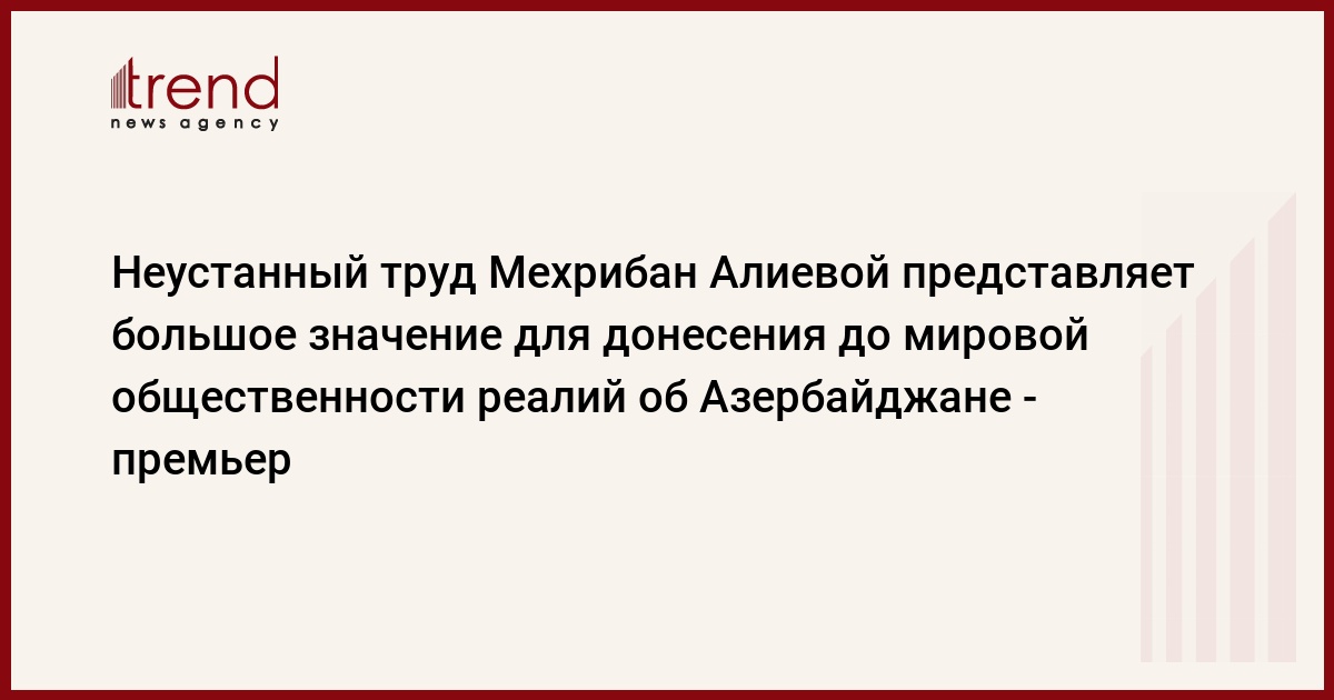 БАКУ /Trend/ - Неустанный труд Мехрибан Алиевой представляет большое значение для донесения до мировой общественности реалий об Азербайджане, сказал в пятницу премьер-министр Артур Расизаде на заседании Милли меджлиса (парламента) страны.