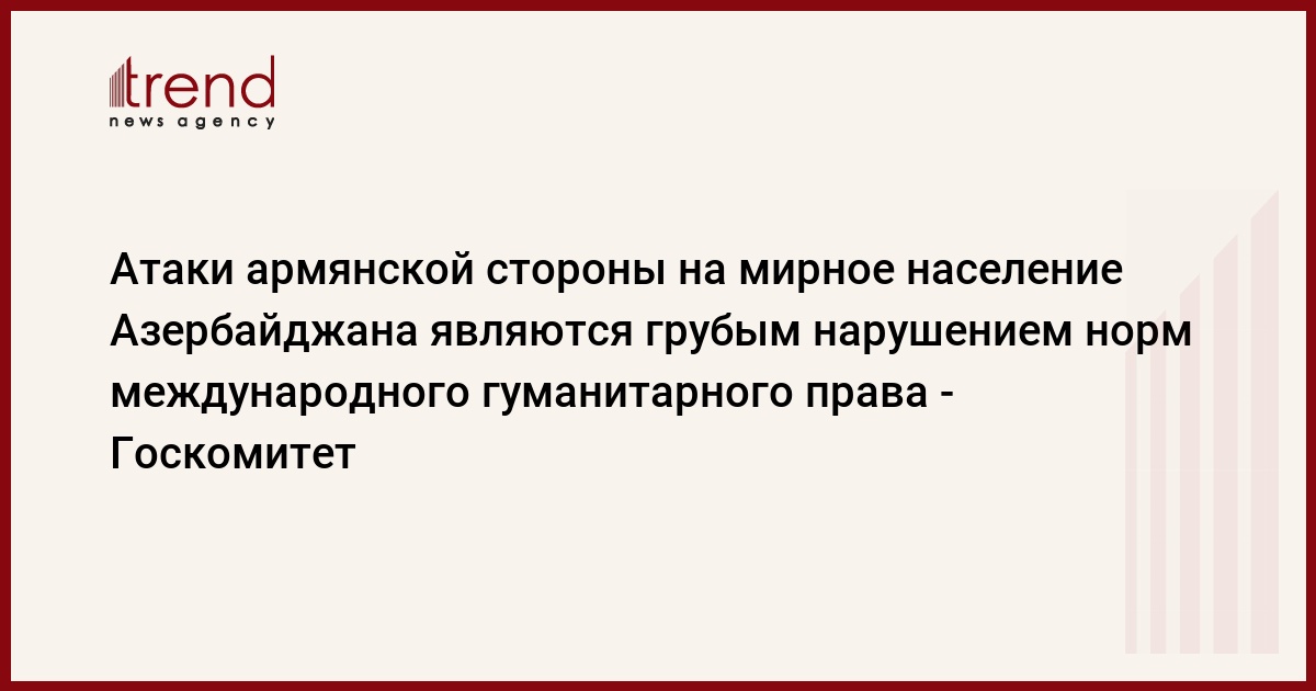 БАКУ /Trend/ - Преднамеренные атаки Армении на мирное население Азербайджана являются грубым нарушением норм международного гуманитарного права. Об этом говорится в заявлении Государственного комитета по проблемам семьи, женщин и детей Азербайджана в связи с очередной провокацией вооруженных сил Армении, в результате которой погибли и были ранены жители села Алханлы Физулинского района.