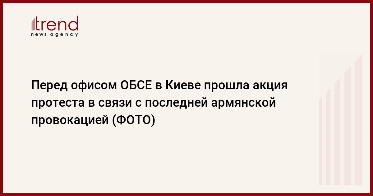 БАКУ /Trend/ - Действующая в Украине Всеукраинская азербайджанская молодежная организация провела акцию протеста перед офисом ОБСЕ и посольством Армении в Киеве в связи с очередной провокацией вооруженных сил Армении, в результате которой погибли двое мирных жителей Азербайджана.