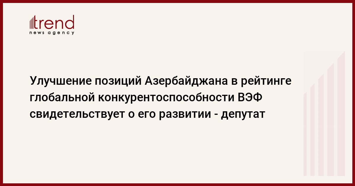 БАКУ/Trend/ - Улучшение позиций Азербайджана в Рейтинге глобальной конкурентоспособности Всемирного экономического форума (ВЭФ) на две ступени, до 35-й позиции, свидетельствует о том, что страна постоянно развивается.