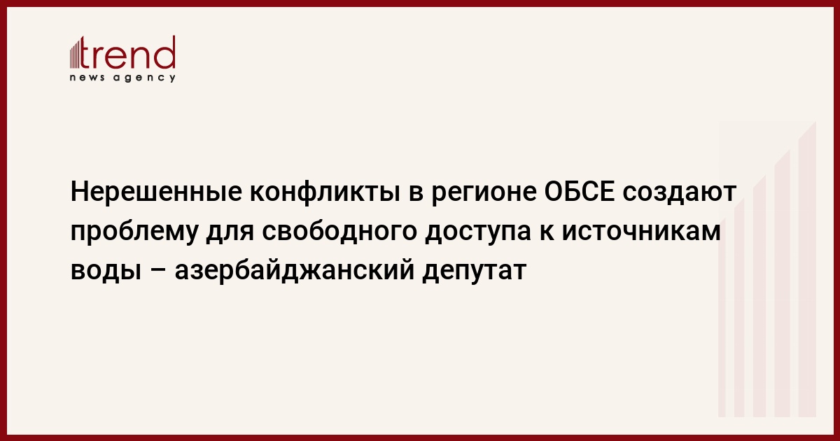 БАКУ /Trend/ - Нерешенные конфликты в регионе ОБСЕ создают проблему для свободного доступа к источникам воды. Об этом член делегации Милли Меджлиса (парламента) Азербайджана в ПА ОБСЕ, депутат Кямран Набизаде сказал, выступая в обсуждениях на тему «Экологическая безопасность: обсуждение проблем изменения климата» в рамках проходящей в Андорре 16-й осенней сессии Парламентской Ассамблеи ОБСЕ (ПА ОБСЕ).