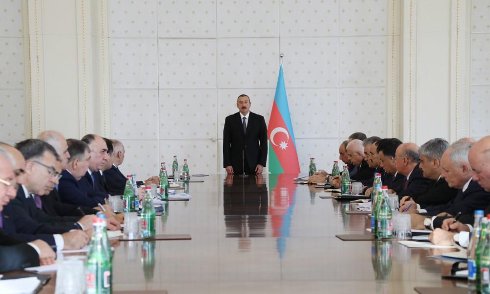 Общественно-политическое положение нашей страны также может быть примером для многих стран. Единство народа и власти как всегда прочное. Экономические показатели, - сегодня эти показатели были озвучены на совещании, - могут быть примером для каждой страны. Наши перспективы таковы – развитие промышленности, сельского хозяйства, реализация инфраструктурных проектов, проектов железной дороги Баку-Тбилиси-Карс, "Южный газовый коридор", разработка месторождений «Азери», «Чираг», «Гюнешли». И это только перечисленные мной основные направления.