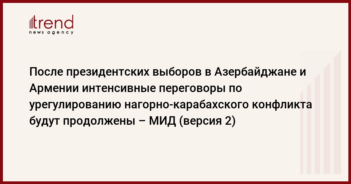БАКУ /Trend/ - После президентских выборов, которые пройдут в Азербайджане и Армении, интенсивные переговоры по урегулированию нагорно-карабахского конфликта на основе существующих мнений и предложений будут продолжены, о чем достигнуто соответствующее соглашение.