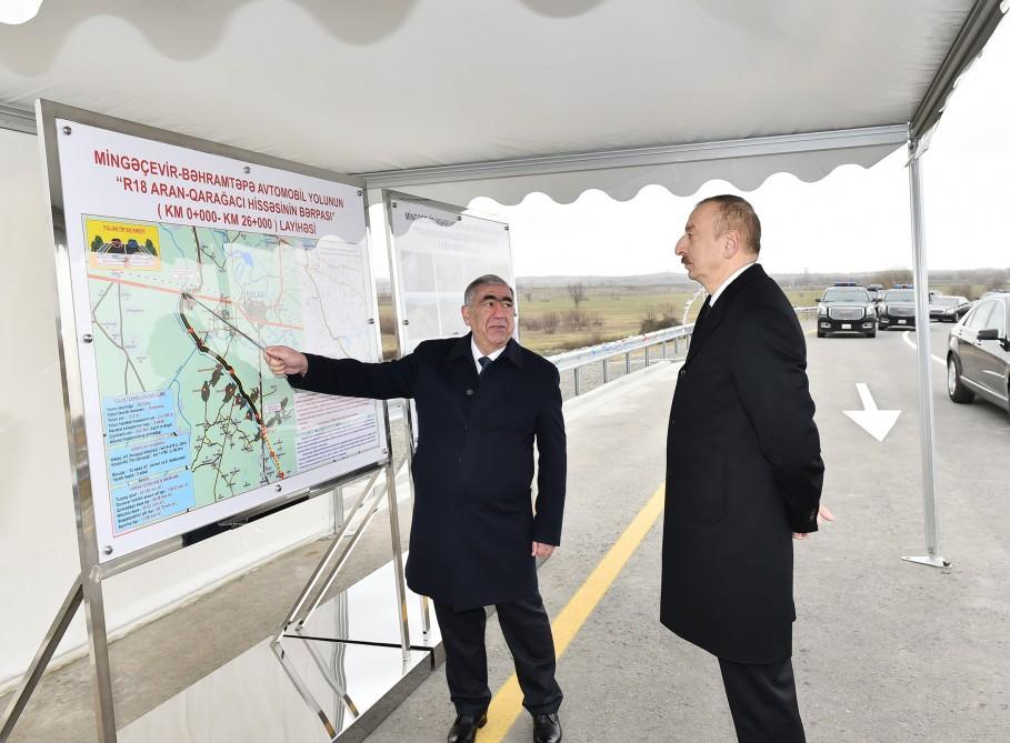 Было сообщено, что общая протяженность дороги составляет 26 километров, а ширина - 12 метров. Дорога, относящаяся к 3-й технической категории, является двухполосной. Ширина каждой из проезжих частей составляет 3,5 метра. В рамках проекта построены два новых моста и пять подземных переходов. Для осуществления работ на высоком качественном уровне Государственное агентство автомобильных дорог в ходе реконструкции дороги мобилизовало все силы. Строительные работы проводились в технической последовательности. Автомобильная дорога Мингячевир- Бахрамтепе имеет важное значение с точки зрения развития экономических связей между регионами нашей республики, в том числе Евлахским, Бардинским, Бейляганским районами, а также туризма и социально-экономического развития регионов, уменьшения транспортных расходов. Наряду со всеми этими особенностями, являясь магистралью, соединяющий транспортные коридоры Восток-Запад и Север-Юг, эта дорога играет важную роль и в повышении эффективности транзитных услуг.