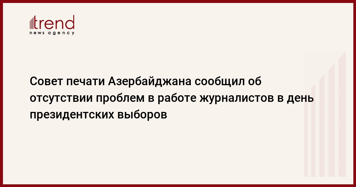 БАКУ /Trend/ - В среду с 8:00 до 15:00 инцидентов с журналистами, выполнявшими профессиональный долг на президентских выборах в Азербайджане, зарегистрировано не было, говорится в среду в сообщении Совета печати Азербайджана.