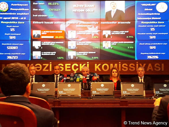 БАКУ /Trend/ - Действующий глава государства, председатель партии "Ени Азербайджан" Ильхам Алиев набрал на президентских выборах в Азербайджане, прошедших 11 апреля, 86,03 процента голосов избирателей по итогам обработки 99,9 процента бюллетеней.