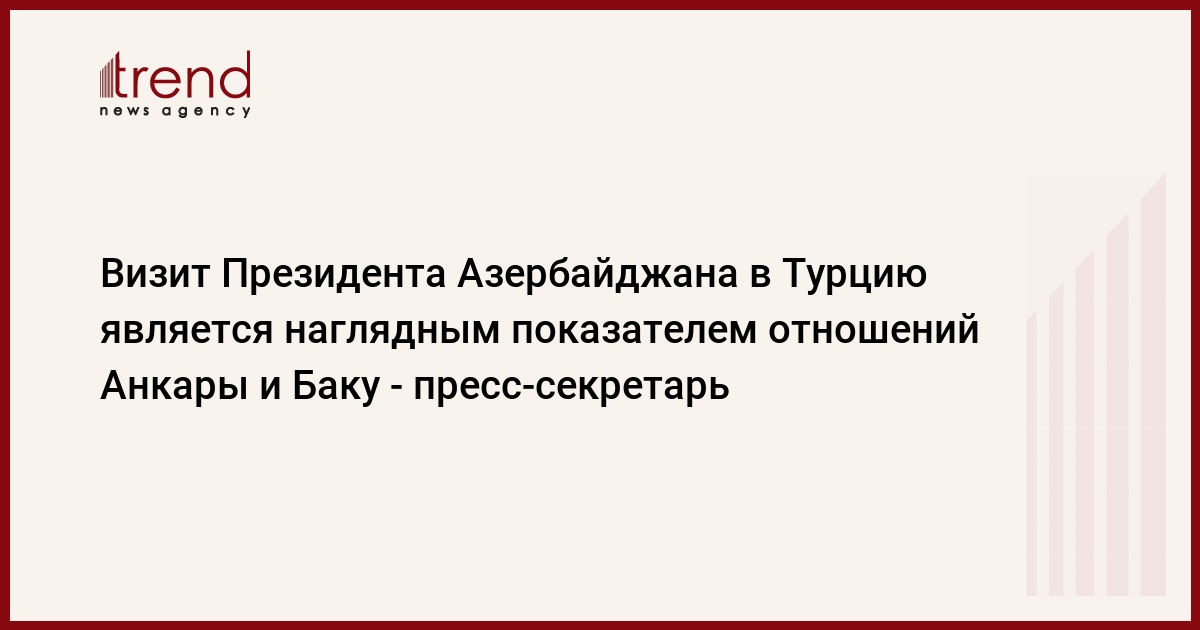БАКУ /Trend/ - Последний визит Президента Азербайджана Ильхама Алиева в Турцию является наглядным показателем отношений Анкары и Баку. Об этом, как сообщают турецкие СМИ, сказал в среду на пресс-конференции пресс-секретарь Президента Турции Ибрагим Калын.