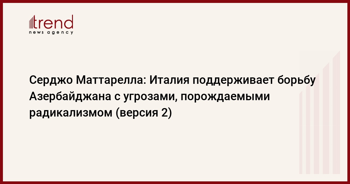 «Итальянская сторона поддерживает борьбу Азербайджана с угрозами, порождаемыми радикализмом. В ходе бесед мы также обменялись мнениями по борьбе с терроризмом и путями незаконной торговли, наши мнения совпадают», - сказал Маттарелла.
