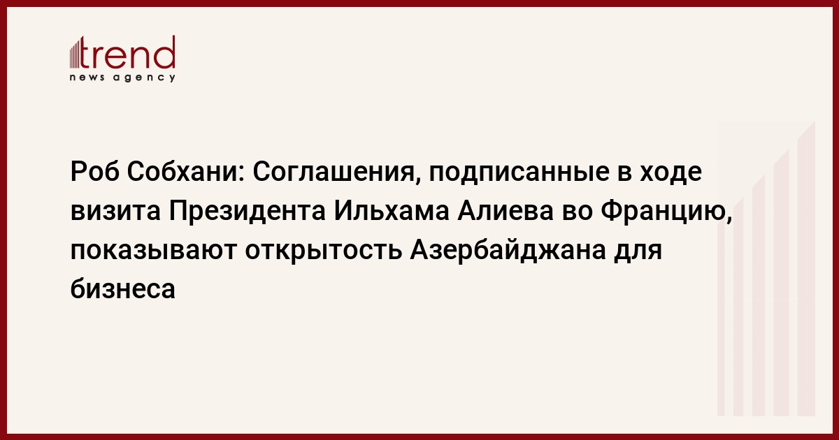 БАКУ /Trend/ - Соглашения, подписанные во время визита Президента Азербайджана Ильхама Алиева во Францию, показывают, что Азербайджан открыт для бизнеса. Об этом сказал в понедельник Trend генеральный директор Caspian Group Holdings Роб Собхани, комментируя заключение между азербайджанскими и французскими компаниями контрактов на сумму более 2 миллиардов долларов во время недавнего визита Президента Ильхама Алиева в Париж.
