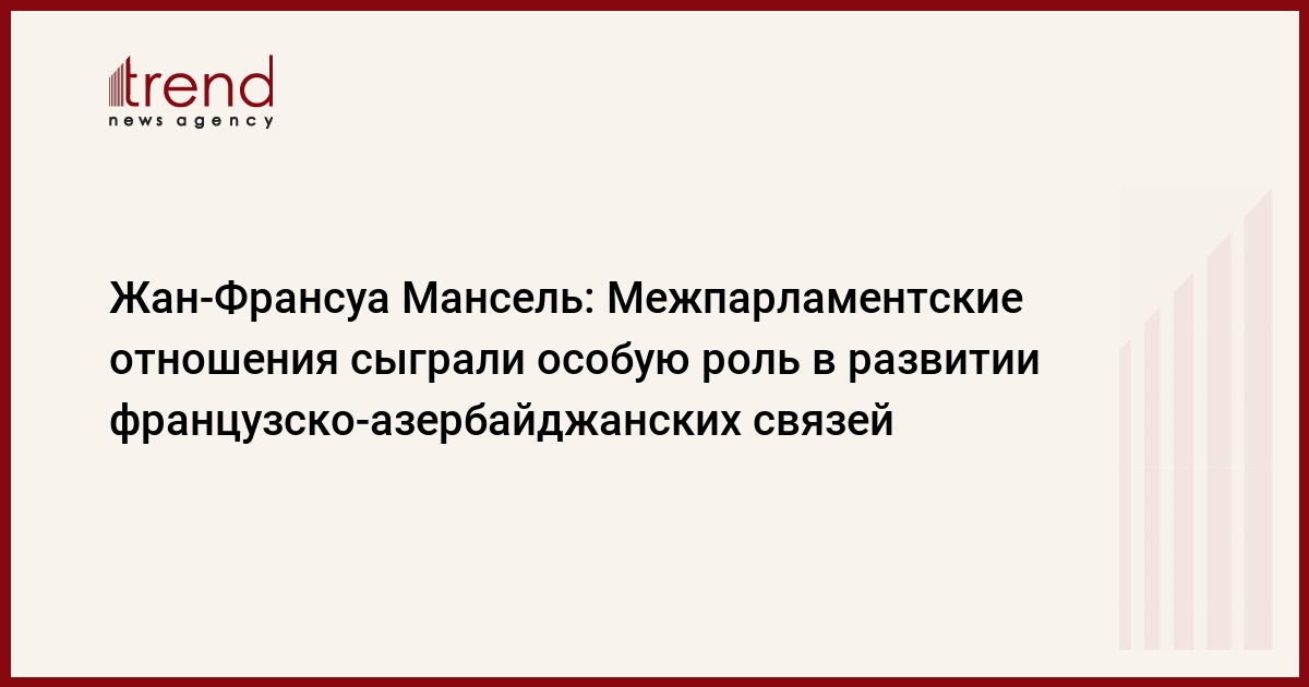 БАКУ /Trend/ - Межпарламентские отношения сыграли особую роль в развитии французско-азербайджанских связей. Об этом сказал президент Ассоциации друзей Азербайджана во Франции Жан-Франсуа Мансель, выступая на торжественном заседании, посвященном 100-летию азербайджанского парламента.
