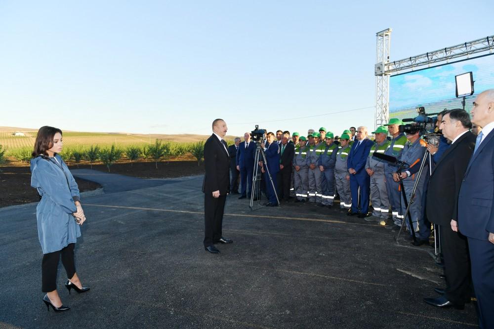 В Азербайджане, в частности, на этой территории, замечательные природные условия, прекрасный климат, плодородная земля. Нам просто необходимо с большой эффективностью использовать эти возможности. Сооружение здесь современных оросительных систем, в первую очередь, пивотной, капельной систем, конечно же, послужит повышению урожайности. Значительная часть агропарка, территория которого составляет две тысячи гектаров, находится под современными оросительными системами, и разбитые здесь прекрасные фруктовые сады – миндальные сады – уже реальность. Еще год назад здесь был пустырь, ничего не росло, никакая работа не проводилась. А сейчас, когда смотришь, радует глаз. Снежные горы и прекрасная лесополоса, лесополоса, которая будет приносить плоды, и граждане Азербайджана будут пользоваться этим.