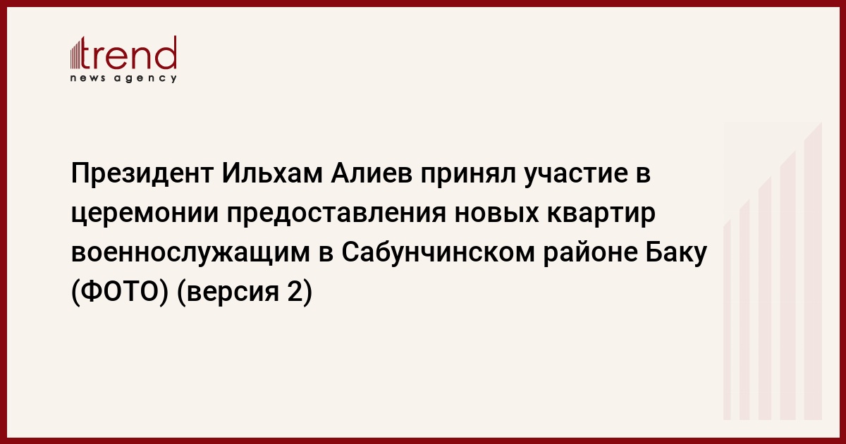 БАКУ /Trend/ - Президент Азербайджана, Верховный главнокомандующий Вооруженными силами Ильхам Алиев в понедельник принял участие в церемонии предоставления новых квартир военнослужащим в Сабунчинском районе.