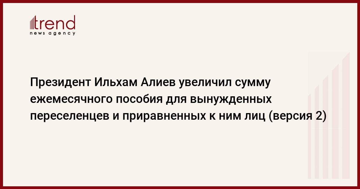 БАКУ /Trend/ - Президент Азербайджана Ильхам Алиев во вторник подписал распоряжение о повышении суммы единого ежемесячного пособия для вынужденных переселенцев и приравненных к ним лиц.