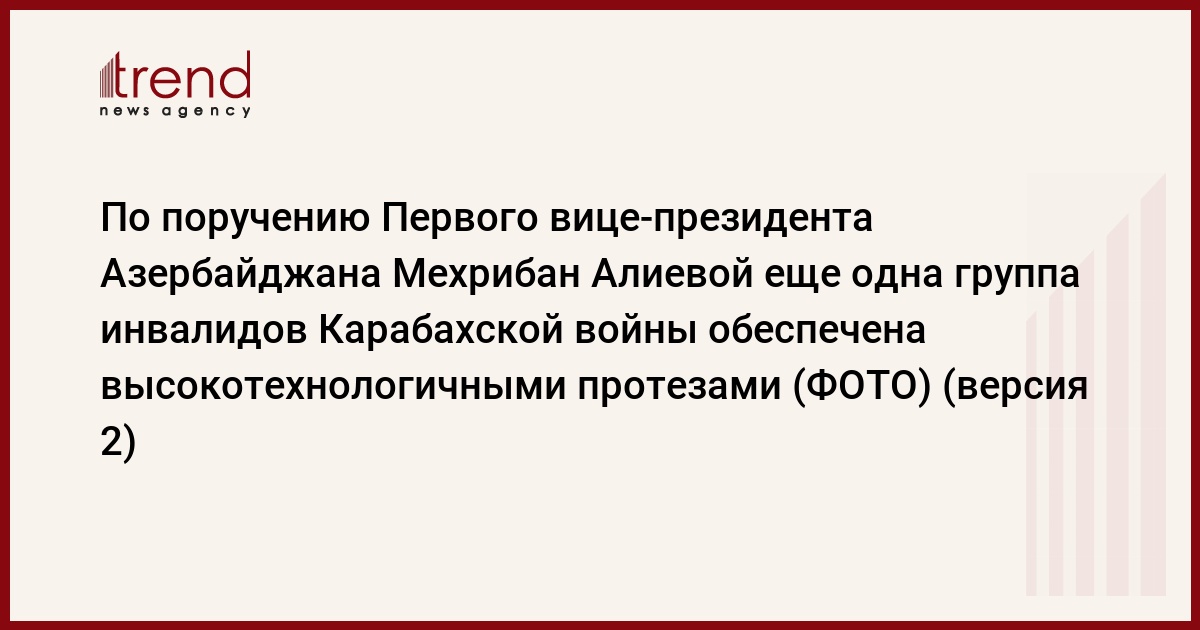БАКУ /Trend/ - По поручению Первого вице-президента Азербайджана, президента Фонда Гейдара Алиева Мехрибан Алиевой, в рамках программы обеспечения высокотехнологичными протезами раненых военнослужащих протезами обеспечена еще одна группа инвалидов Карабахской войны, сообщает в среду Trend со ссылкой на Фонд.