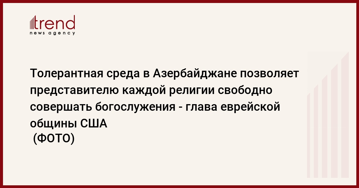 Руководитель и создатель Фонда этнического взаимопонимания США, раввин Марк Шнайер отметил, что стал живым свидетелем межрелигиозной гармонии в Азербайджане. Шнайер сказал, что образцовая толерантная среда в стране позволяет представителю каждой религии свободно совершать богослужение.