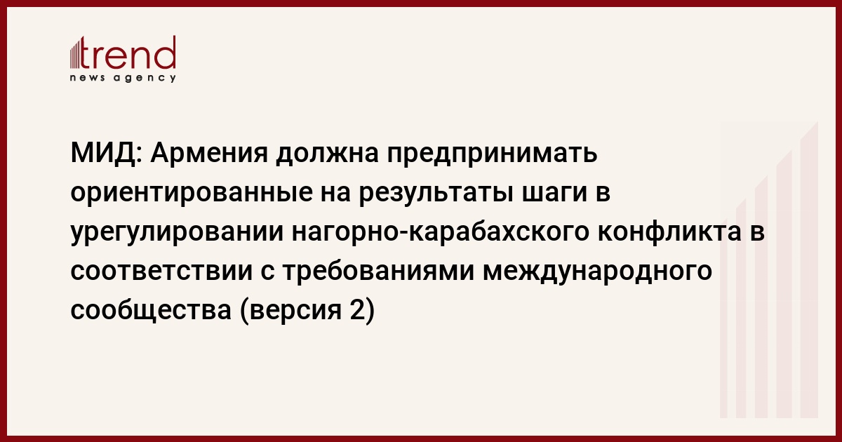 БАКУ /Trend/ - Армения должна предпринимать ориентированные на результаты шаги в урегулировании нагорно-карабахского конфликта в соответствии с требованиями международного сообщества. Об этом, как передает в воскресенье Trend, говорится в комментарии пресс-службы МИД Азербайджана в связи с последним заявлением министерства иностранных дел Армении.