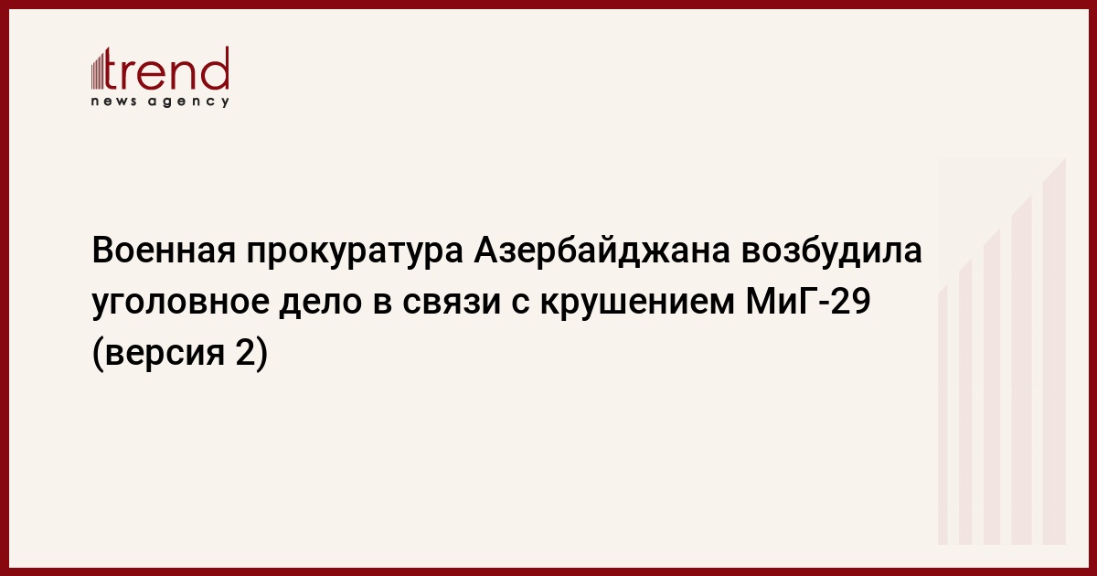 БАКУ /Trend/ - В связи с крушением самолета MиГ-29 ВВС Азербайджана Военная прокуратура возбудила уголовное дело. Создана следственная группа из опытных и профессиональных сотрудников Военной прокуратуры, начаты следственные действия, сообщает в четверг Trend со ссылкой на пресс-службу Военной прокуратуры.