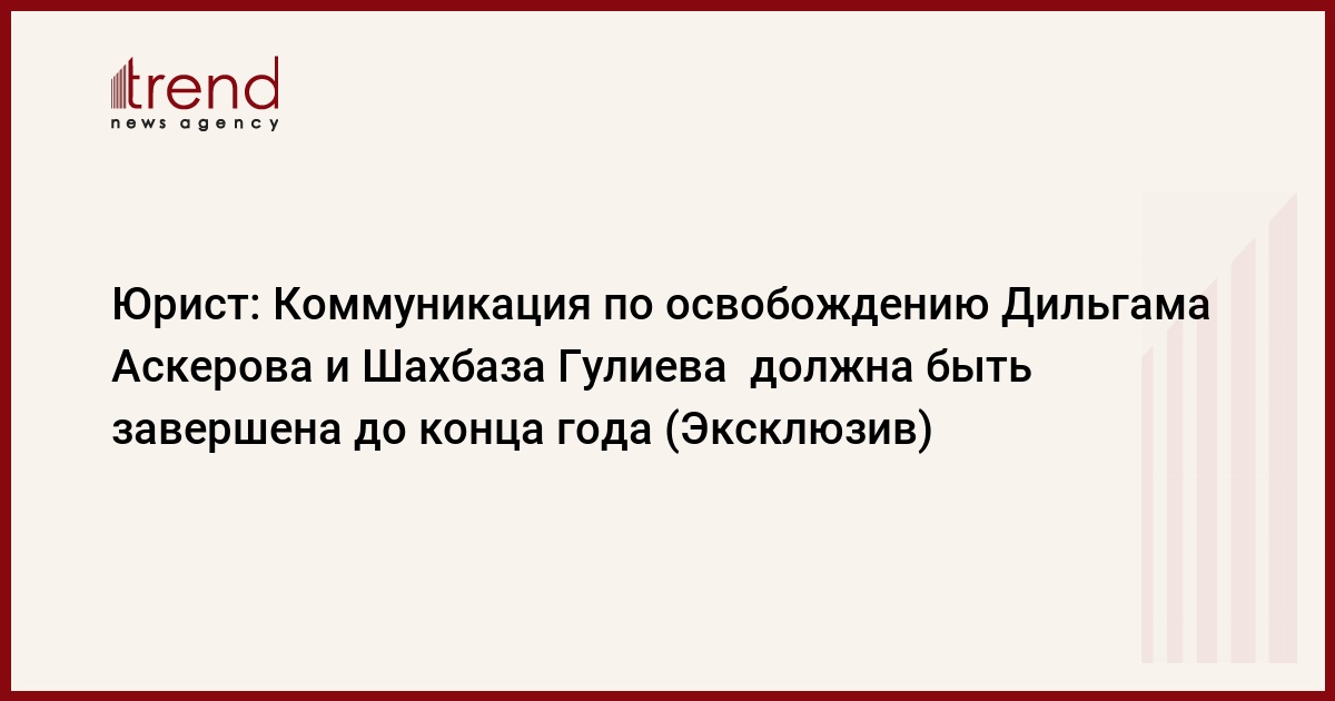 БАКУ /Trend/ - В настоящее время в Европейском суде по правам человека (ЕСПЧ) продолжается коммуникация по освобождению азербайджанских заложников Дильгама Аскерова и Шахбаза Гулиева. Ожидается, что коммуникация завершится до конца этого года. Об этом в пятницу сказал Trend председатель Коллегии адвокатов Анар Багиров.