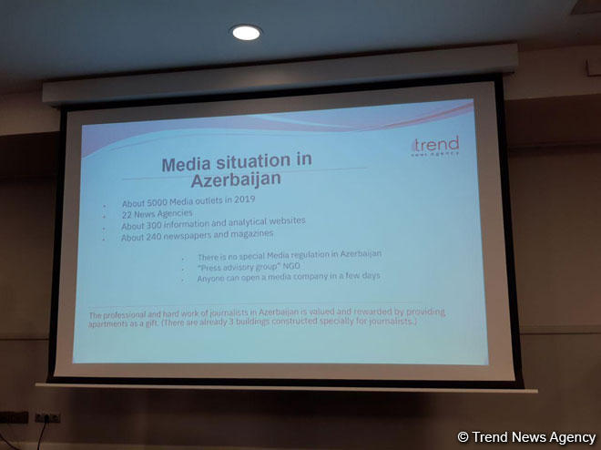 Она в своей презентации на примере становления и продвижения в мире информационного агентства Trend представила собравшимся журналистам из многих стран ситуацию в сфере СМИ Азербайджана, рассказала о влиянии на успехи Trend свободной, демократичной атмосферы в медиапространстве страны, о большой роли поддержки, которая оказывается развитию медиа со стороны государства.