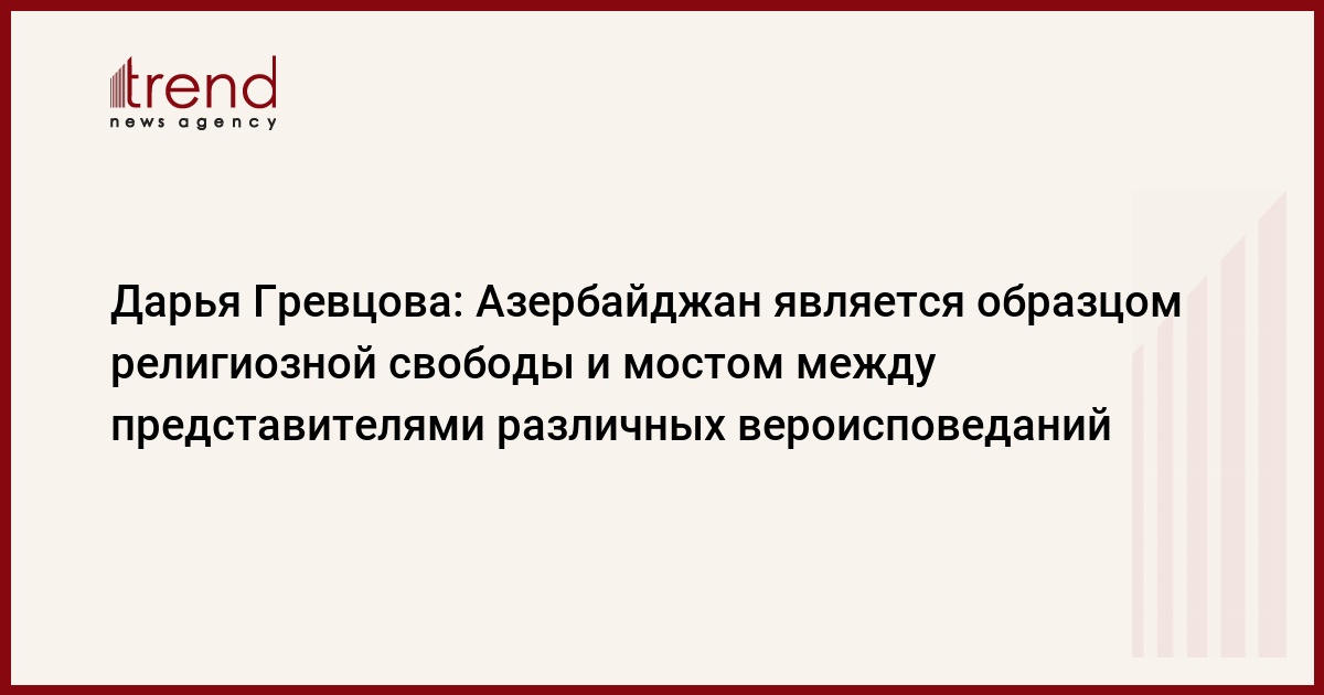 «Проведение в Баку второго саммита мировых религиозных лидеров указывает на то, что Азербайджан является образцом религиозной свободы и мостом между представителями различных вероисповеданий. С другой стороны, весьма символично, что такого рода важные мероприятия проходят именно в Азербайджане, который находится на перекрестке Востока и Запада. Высокий уровень проведения мероприятий важнейшего значения требует больших усилий, финансовых вложений, а также соответствующей инфраструктуры для приема гостей со всех частей света. Вся эта колоссальная работа, которая проводится каждый раз в Азербайджане под руководством главы государства Ильхама Алиева, достойна глубокого уважения и благодарности. В то же время проведение мероприятий политического значения именно в Баку вполне оправданно, поскольку страна является образцом стабильности и безопасности во всем регионе Южного Кавказа», - сказала Гревцова.