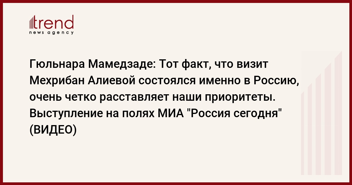 Как сообщает Trend, об этом сказала заместитель генерального директора АМИ "Trend", вице-президент Экспертного совета Baku Network Гюльнара Мамедзаде на полях МИА "Россия сегодня" в Москве.