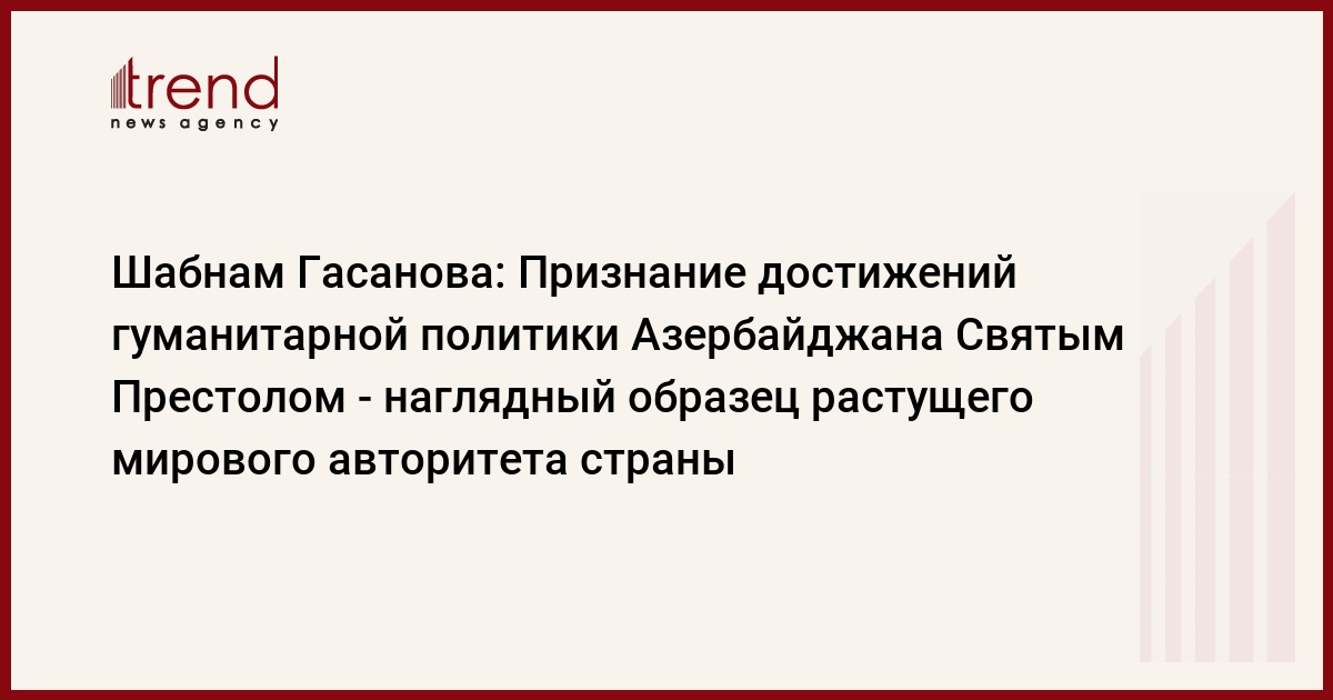 “Тот факт, что в ходе встречи Президента Ильхама Алиева и Первой леди Мехрибан Алиевой с Папой Римским Франциском 22 февраля глава Католической церкви отметил общественно-политическую стабильность в Азербайджане, что народ живет в благоденствии, в очередной раз доказывает вышесказанное. Во время встречи Папа Римский Франциск, затронув толерантные отношения между религиозными общинами в стране, высокое оценил усилия Азербайджана в этой области. Именно наглядным образцом этого и является то, что в этом направлении Азербайджан принял важные международные мероприятия. Сегодня страна вносит свой вклад в установление взаимопонимания, братства и солидарности между представителями различных религий во всем мире, и с этой точки зрения является образцом для всего мира. Модель толерантности и мирного сосуществования, представленная Азербайджаном, - один из главных факторов, позволяющих устранить столкновения и противостояния, наблюдаемые в мире. Страна прилагает титанические усилия для поощрения межрелигиозного и межкультурного диалога. В Азербайджане укрепился межкультурный диалог, а также гармония, царящая между мусульманами, христианами и иудеями. Условия, созданные для деятельности Католической церкви в Азербайджане, также находятся на самом высоком уровне", - сказала Гасанова.