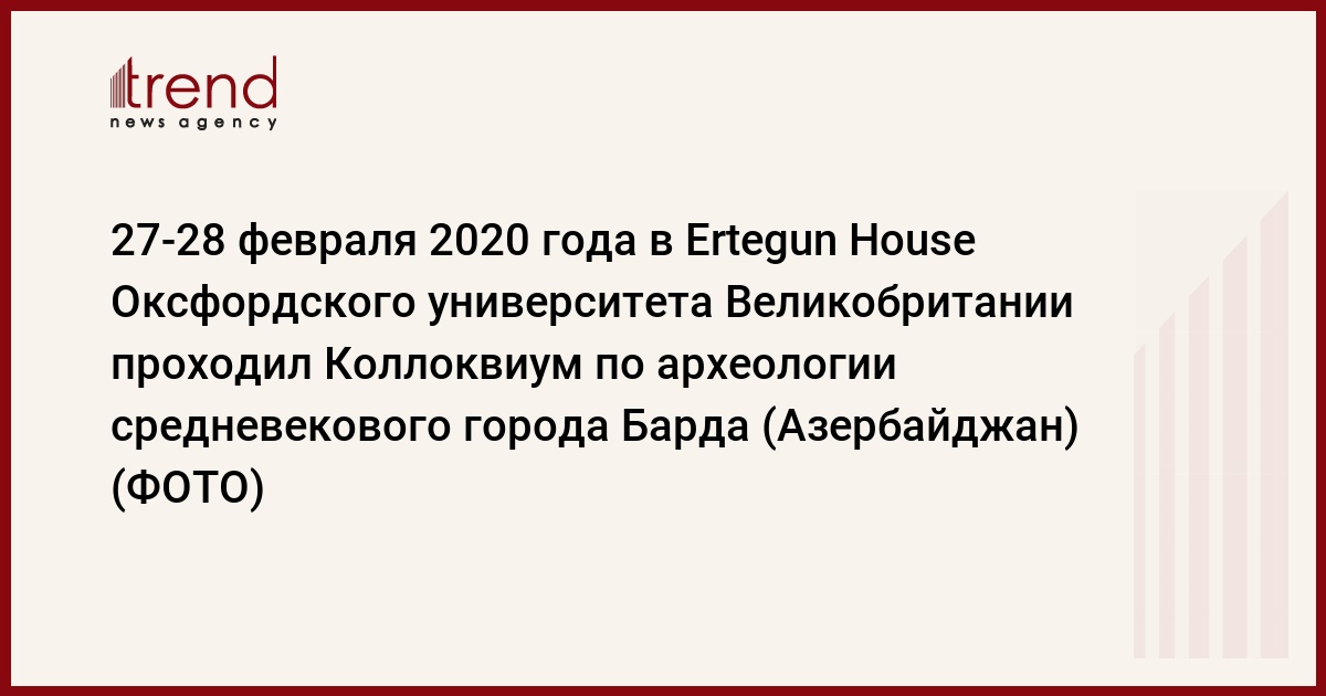 БАКУ /Trend/ - Проект «Археологические исследования Барды» является одной из важных научных инициатив Оксфордского Центра Низами Гянджеви, созданного в 2013-м году на постоянной основе в структуре Оксфордского университета - старейшего и авторитетнейшего университета мира, с целью изучения истории, языков и культур Азербайджана, Кавказа и Центральной Азии. Среди множества интересных проектов, реализуемых Центром, таких как осуществление переводов на высоком академическом уровне научных трудов, организация международных конференций, изучение рукописей, подготовка аспирантов и магистрантов, особое место занимает проведение археологических исследований в городе Барда. Одной из главных целей археологических экспедиций является доведение до мировой научной общественности более полной информации о древнем наследии и богатой истории азербайджанского города. За день до начала Коллоквиума состоялась лекция Скотта Редфорда, представляющего Кафедру истории искусства и археологии Научно-исследовательского центра Халили Оксфордcкого Университета, профессора Университета SOAS. Тема лекции - «Средневековый Южный Кавказ (XI – XIII века)». В рамках программы Коллоквиума состоялись 4 научные сессии, в которых выступили участники бардинских археологических исследований.