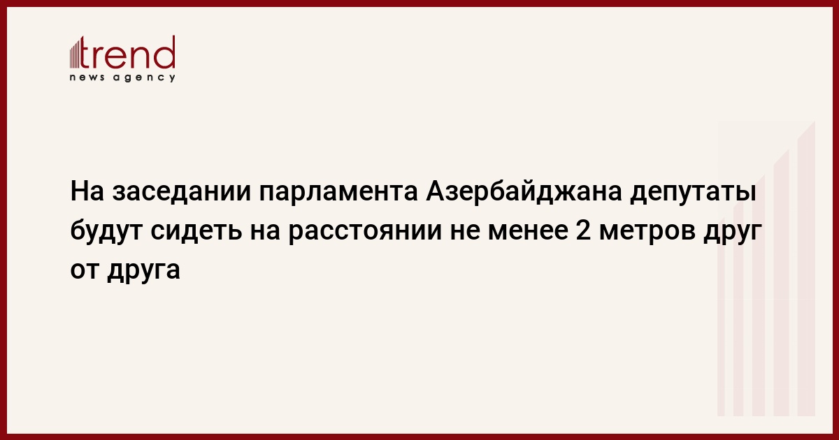 БАКУ /Trend/ - В ходе очередного пленарного заседания Милли Меджлиса (парламента) Азербайджана 30 марта 2020 года депутаты будут сидеть на расстоянии не менее 2 метров друг от друга, сообщили в пятницу Trend в пресс-службе парламента.
