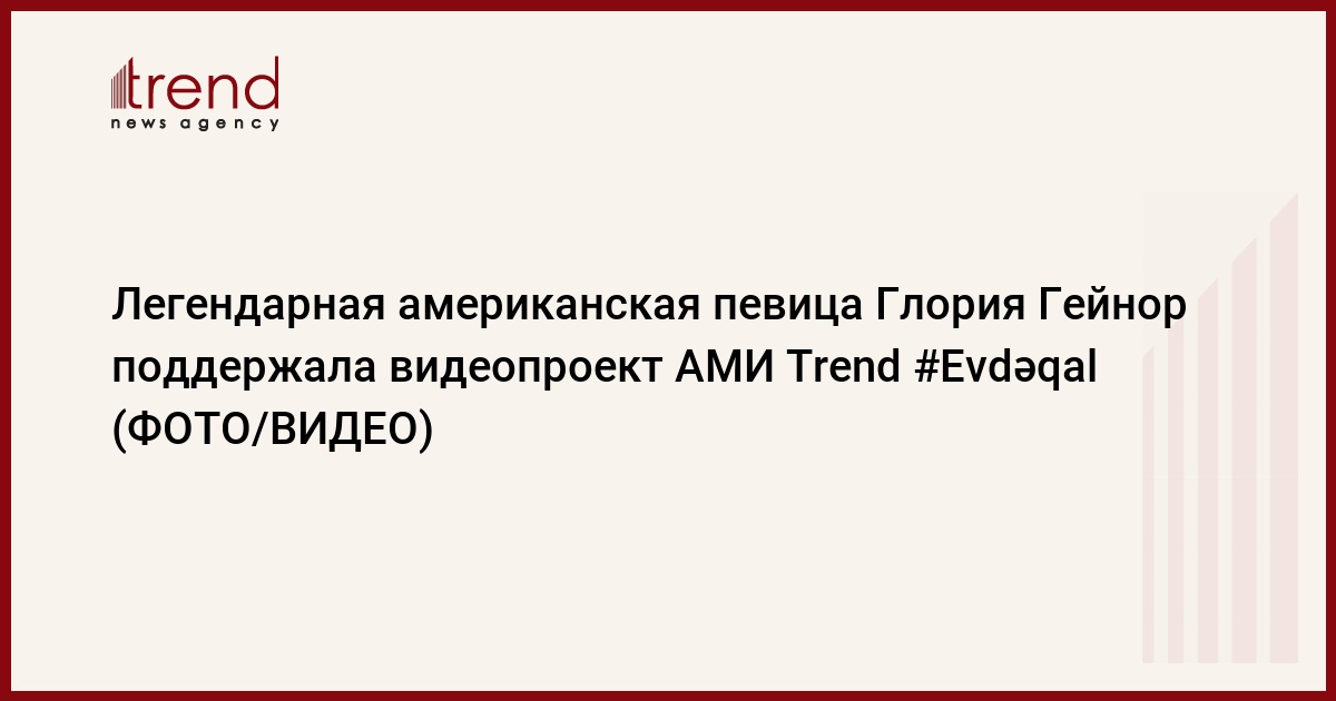 БАКУ /Trend/ - Легендарная американская певица Глория Гейнор поддержала видеопроект Агентства международной информации Trend, посвященный кампании #Evdəqal, сообщает в четверг Trend.