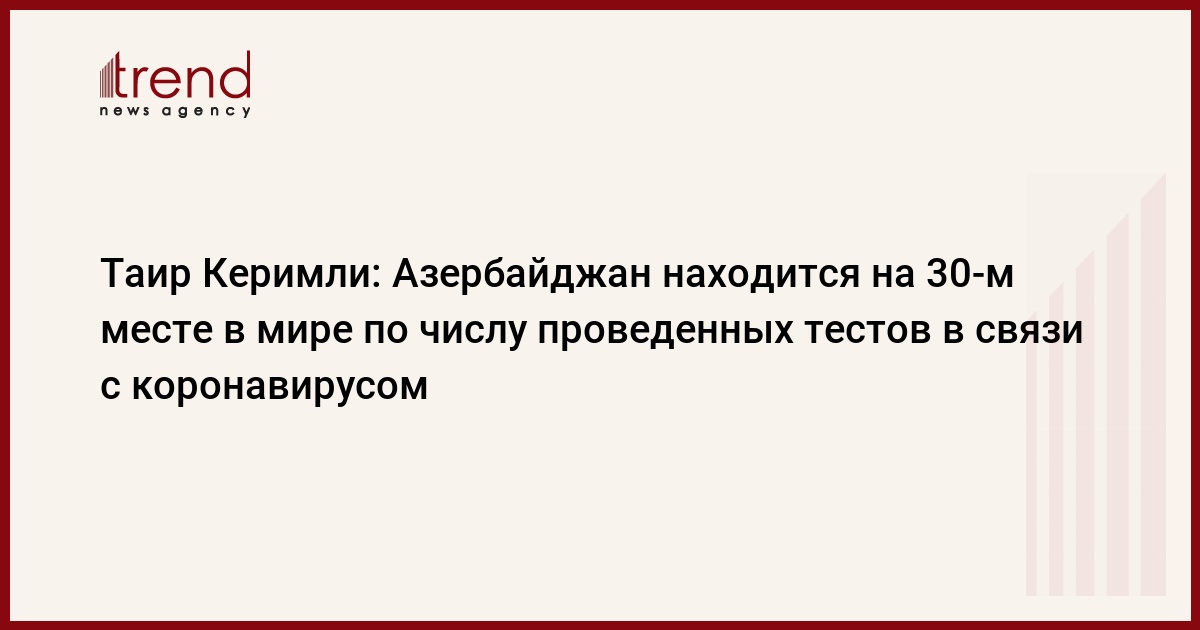 БАКУ /Trend/ - По общему числу тестов, проведенных в связи с коронавирусом, Азербайджан занимает 30-е, а по количеству тестов на каждый миллион человек - 40-е место в мире.