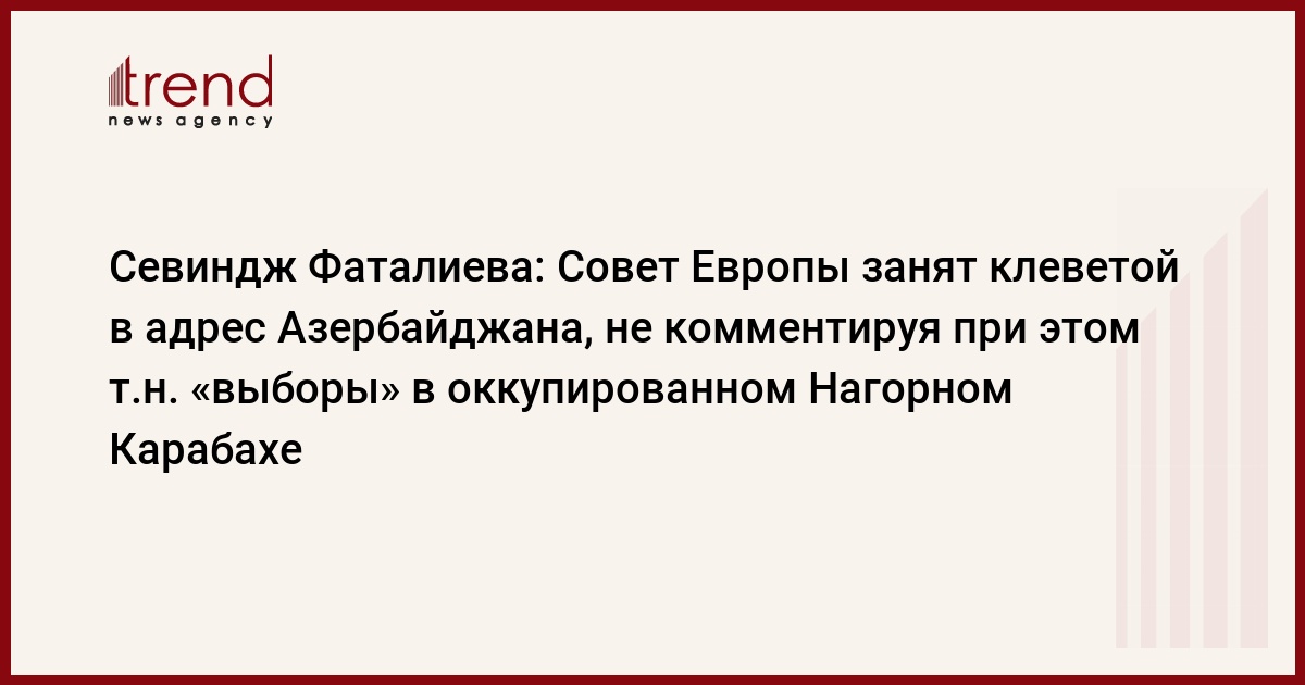 Она отметила, что в конце марта Армения и сепаратистский режим провели так называемые «выборы» в оккупированном Нагорном Карабахе: «Абсолютное большинство мировых стран и международных организаций не признали эти т.н. «выборы». Но Совет Европы не прокомментировал это шоу т.н. «выборов». Как отметил Президент Ильхам Алиев, эта организация делает все возможное, чтобы оклеветать Азербайджан. Естественно, это показатель того, каким интересам организации служит этот факт. В действительности эта организация переживает серьезный кризис и нуждается в серьезных реформах».