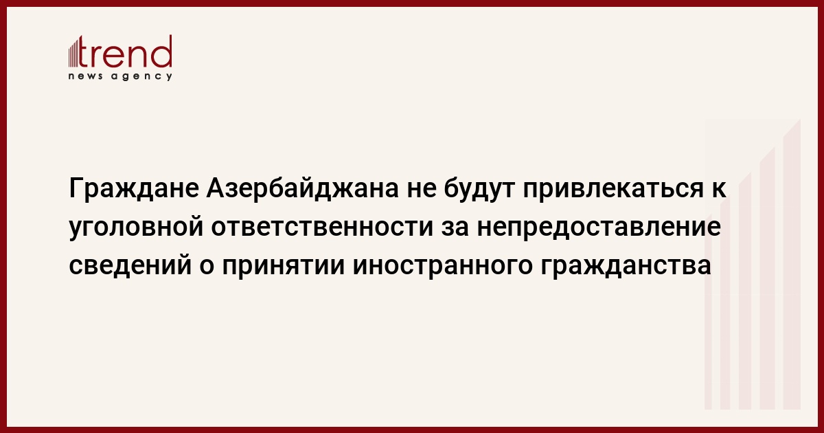 БАКУ/Trend/ - Граждане Азербайджана не будут привлекаться к уголовной ответственности за непредоставление в течение одного месяца письменных сведений о принятии иностранного гражданства в соответствующий орган исполнительной власти.