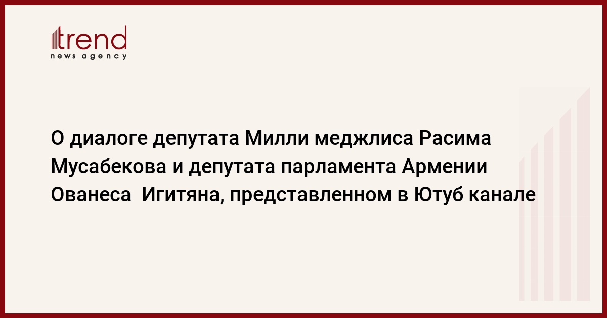 БАКУ /Trend/ - В последние дни внимание общественности привлекает диалог депутата Милли меджлиса Расима Мусабекова и депутата парламента Армении Ованеса Игитяна, представленном в Ютуб канале. Интерес обусловлен тем, что оба депутата являются экспертами по международной политике, поэтому небезынтересно послушать альтернативные аргументации специалистов о путях решения Карабахской проблемы. Хотя в который раз мы убеждаемся в бессмысленности диалога с представителями армянской элиты, в сознании которых укоренилась параноидальная мысль об их древности, исключительности, дающее им особое право на агрессивность по отношению к соседним народам. Хорошо известны исторические примеры наций, претендующих на историческую исключительность, именно данная политическая болезнь привела в Германии Гитлера к власти и обернулась вскоре крахом для немцев.