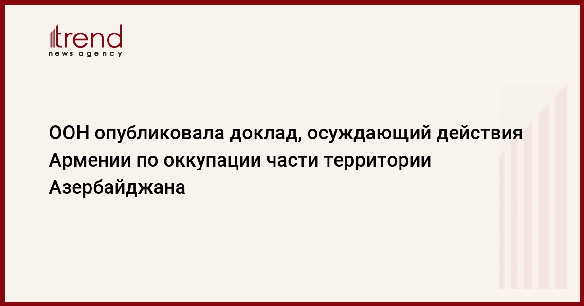 БАКУ/Trend/ - В штаб-квартире ООН в Нью-Йорке опубликован всеобъемлющий доклад о международно-правовых обязательствах страны-агрессора Армении, которая оккупировала часть территорий Азербайджана.