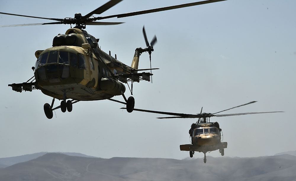 В районе учений проведены показательные учебные полеты вертолетов, приведенных в состояние полной боеготовности.