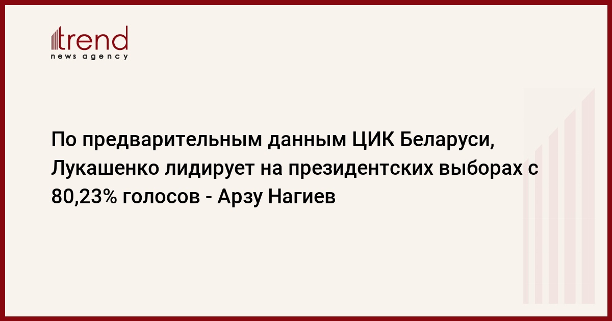БАКУ /Trend/ - По предварительным итогам президентских выборов в Беларуси, действующий президент страны Александр Лукашенко набрал 80,23 процента голосов.