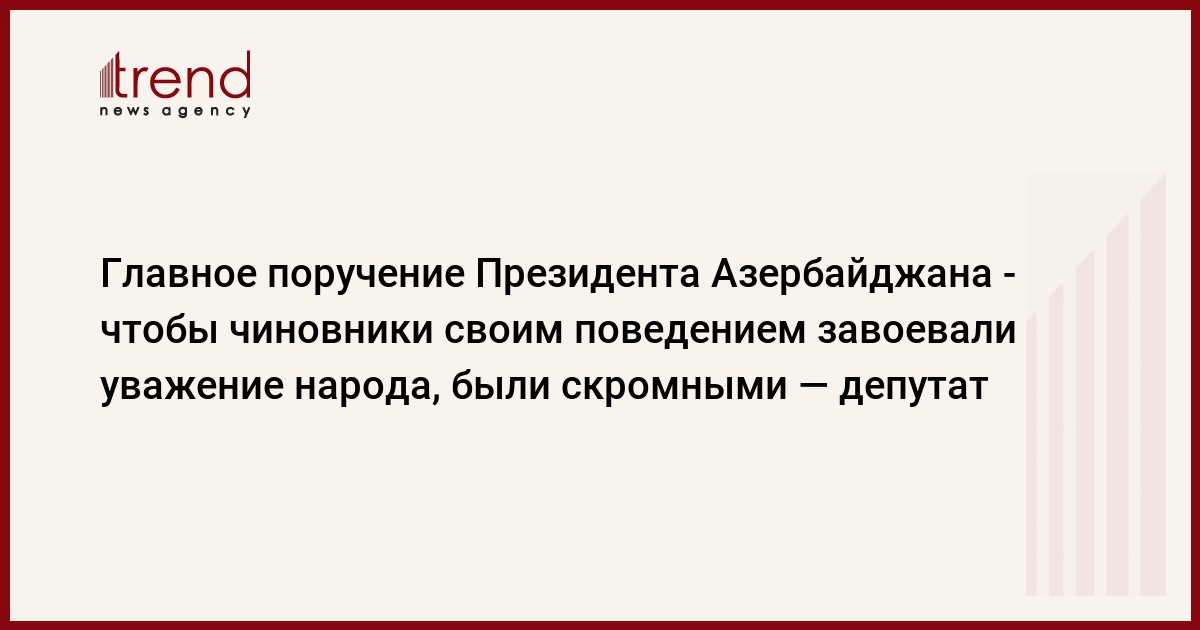 "Как известно, такого же подхода к народу глава государства ожидает от каждого государственного чиновника. В этой связи основная задача, поставленная главой государства, который в своих выступлениях говорит: "Каждый чиновник должен быть слугой народа", заключается в том, чтобы чиновники, а также их близкие родственники, своим поведением завоевали уважение народа, были скромными", - отметил Искендеров.
