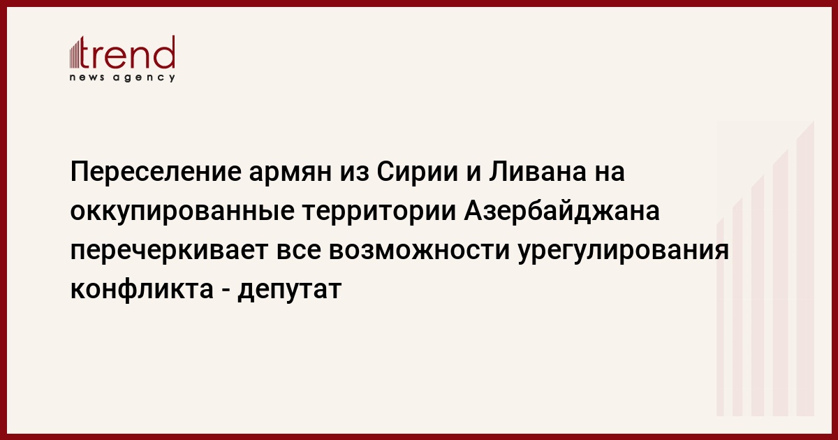 БАКУ /Trend/ - Переселение этнических армян из Ливана на оккупированные территории Азербайджана полностью противоречит нормам и принципам международного права. Тем самым Армения перечеркивает все возможности для мирного урегулирования нагорно-карабахского конфликта.