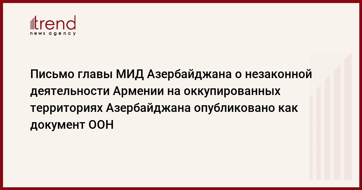Министр иностранных дел Азербайджана Джейхун Байрамов призвал генсека ООН предпринять все необходимые шаги для того, чтобы пресечь агрессивную провокационную риторику Армении, а равно и деятельность, направленную на уничтожение культурного наследия и изменение демографической ситуации на оккупированных территориях, а также принудить ее соблюдать обязательства международного права и вывести оккупационные войска с захваченных азербайджанских территорий.