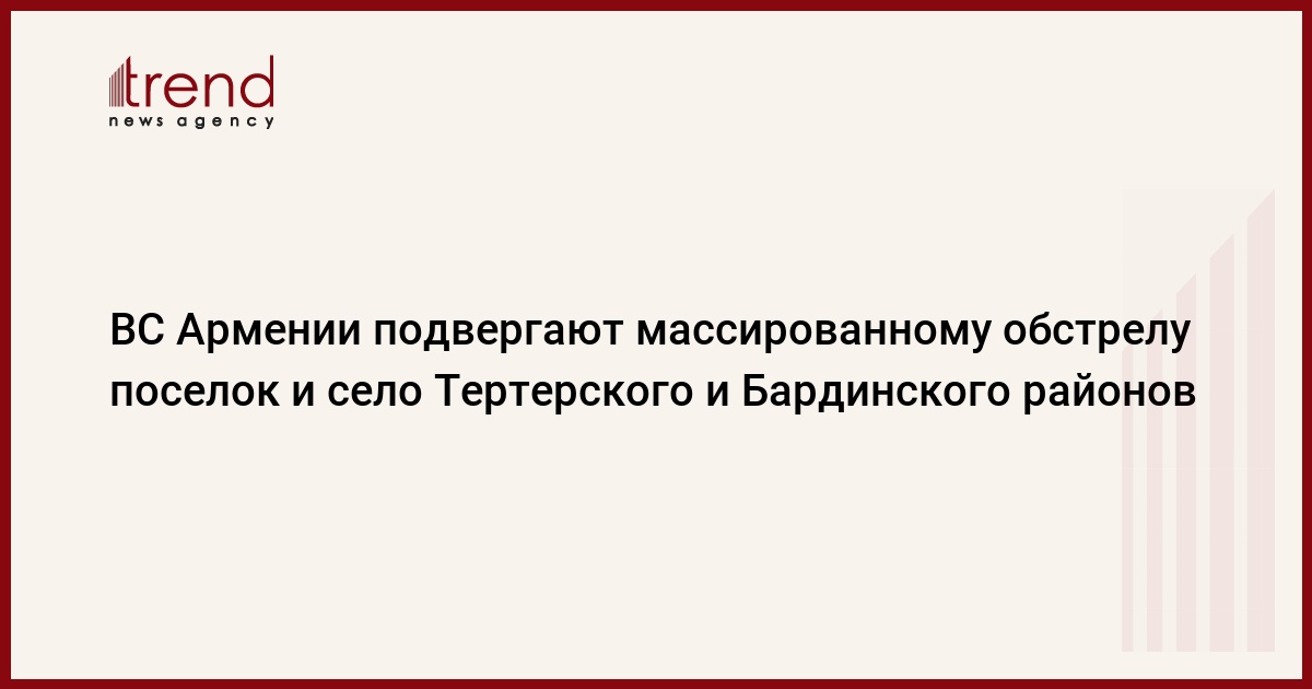 БАКУ /Trend/ - Армянские вооруженные силы подвергают массированному обстрелу город Тертер, поселок Шыхарх Тертерского района и село Соганвердилер Бардинского района, сообщает в пятницу Trend со ссылкой на пресс-службу министерства обороны.