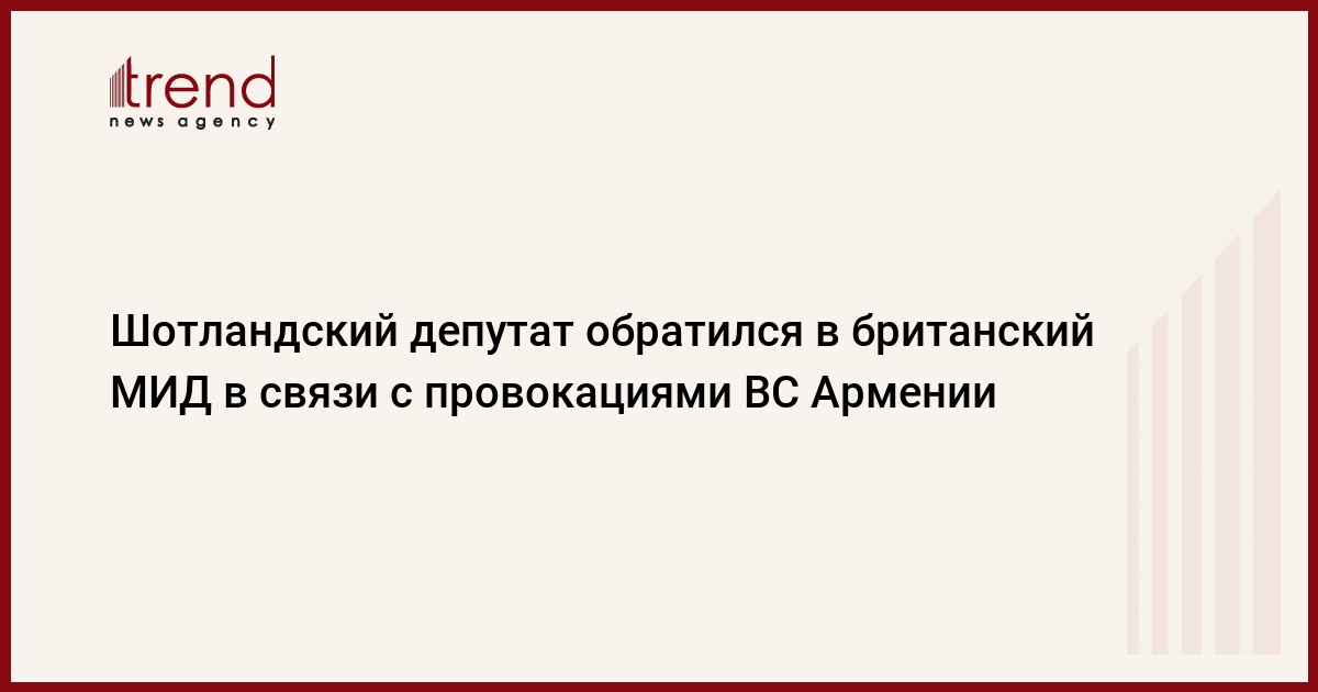 БАКУ /Trend/ - По инициативе главы Азербайджано-Шотландского альянса Фуада Алекперова, шотландский депутат Алин Смит направил обращение министерству иностранных дел Великобритании в связи с напряженностью, возникшей между Азербайджаном и Арменией 27 сентября.