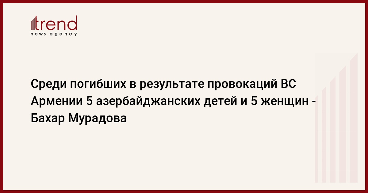 БАКУ /Trend/ - В ходе провокаций ВС Армении, начавшихся с 27 сентября, до сегодняшнего дня погиб 31 мирный житель, среди которых 5 детей и 5 женщин.